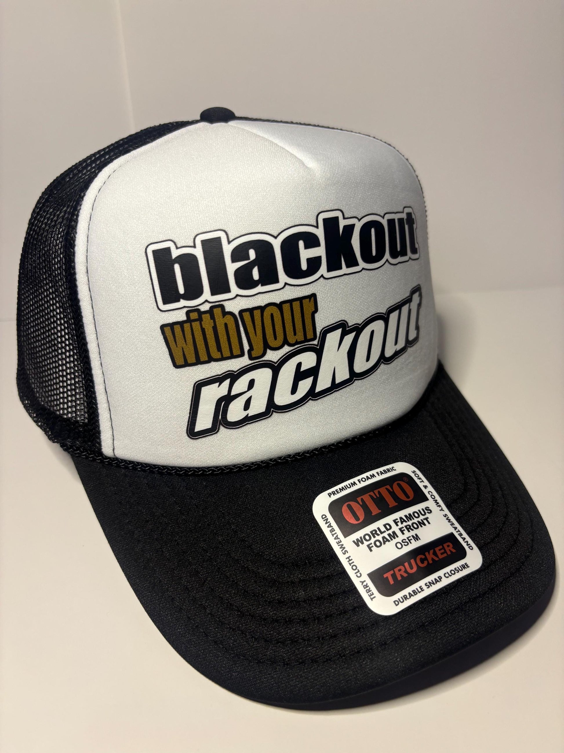 Blackout with your Rack Out Custom Trucker Hat with parody design, Adjustable Snapback Closure, and Ideal for Any Occasion