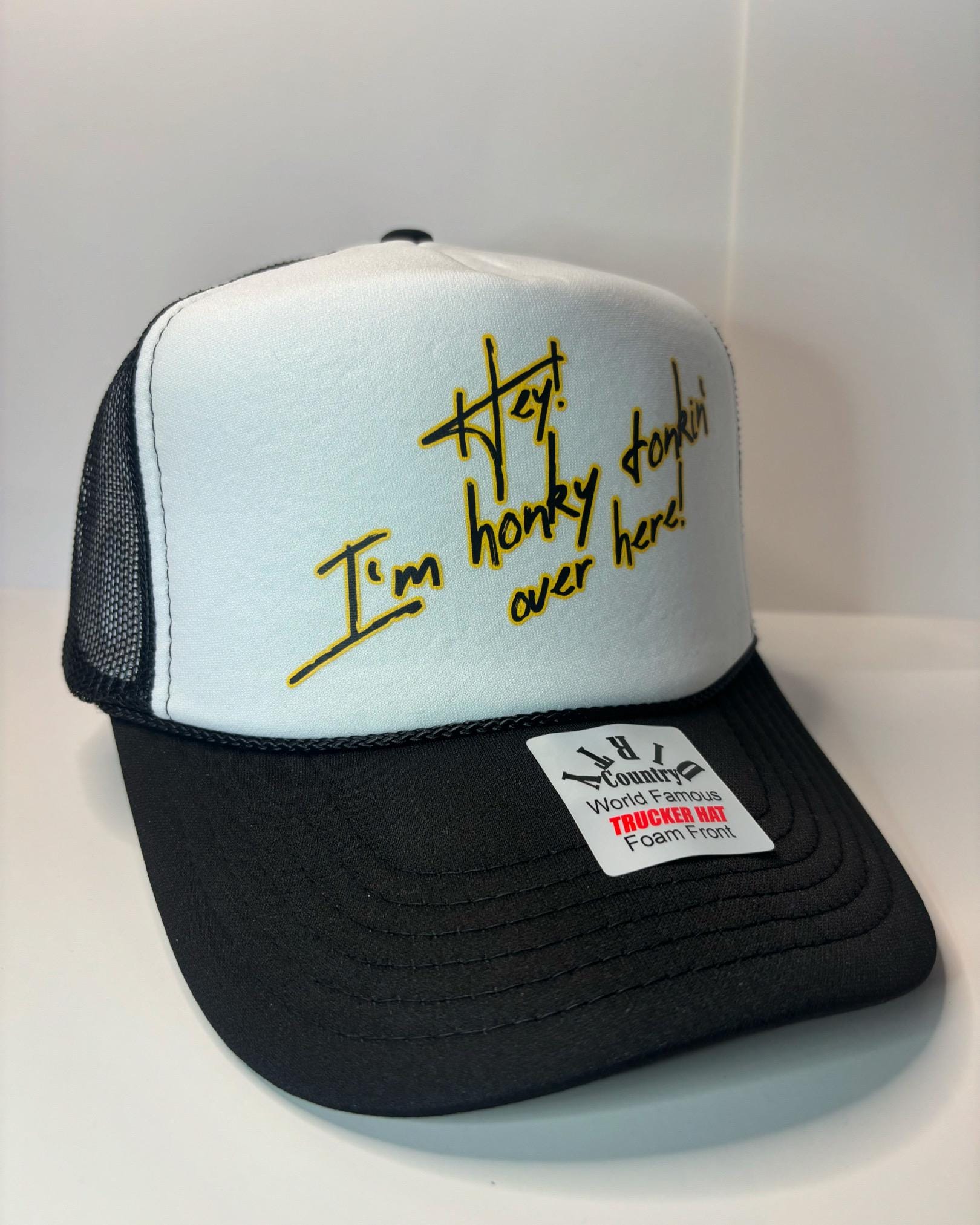 Hey I’m Honky Tonkin’ over here Custom Trucker Hat with parody design, Adjustable Snapback Closure, and Ideal for Any Occasion
