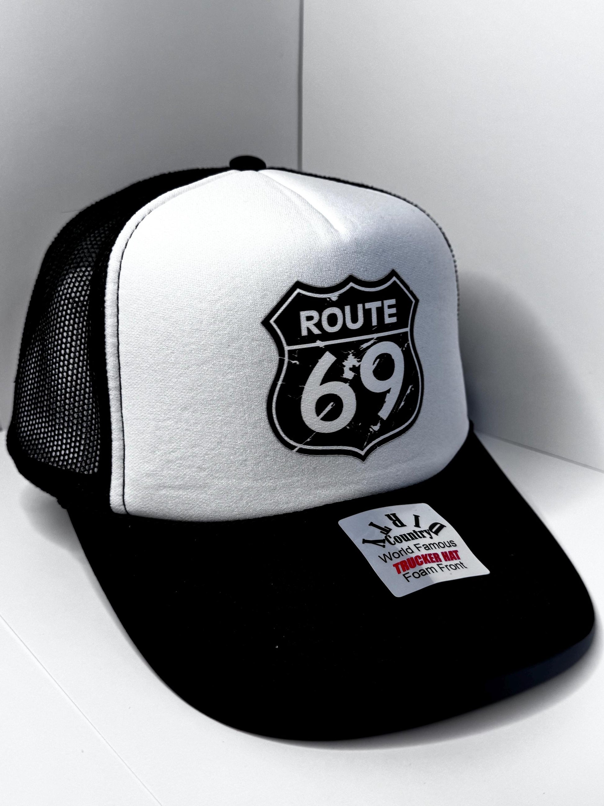 Route 69 Custom Trucker Hat with parody design, Adjustable Snapback Closure, and Ideal for Any Occasion