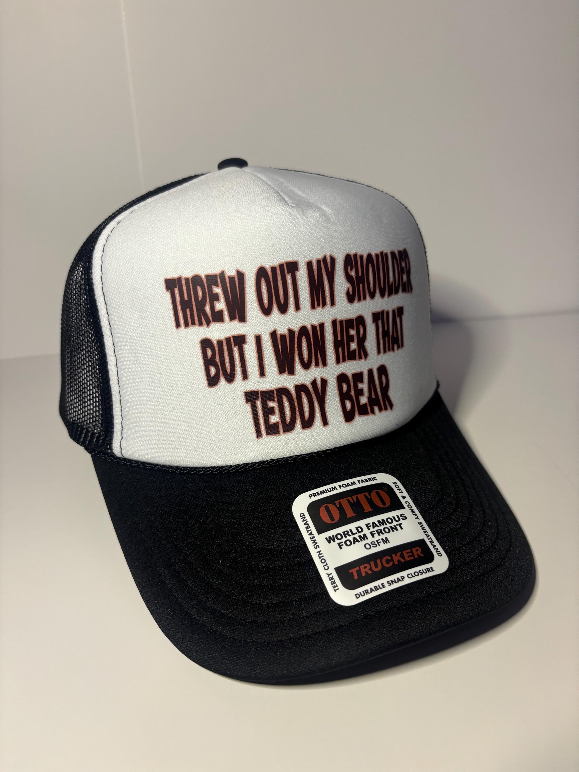 Threw out my Shoulder Custom Trucker Hat with parody design, Adjustable Snapback Closure, and Ideal for Any Occasion