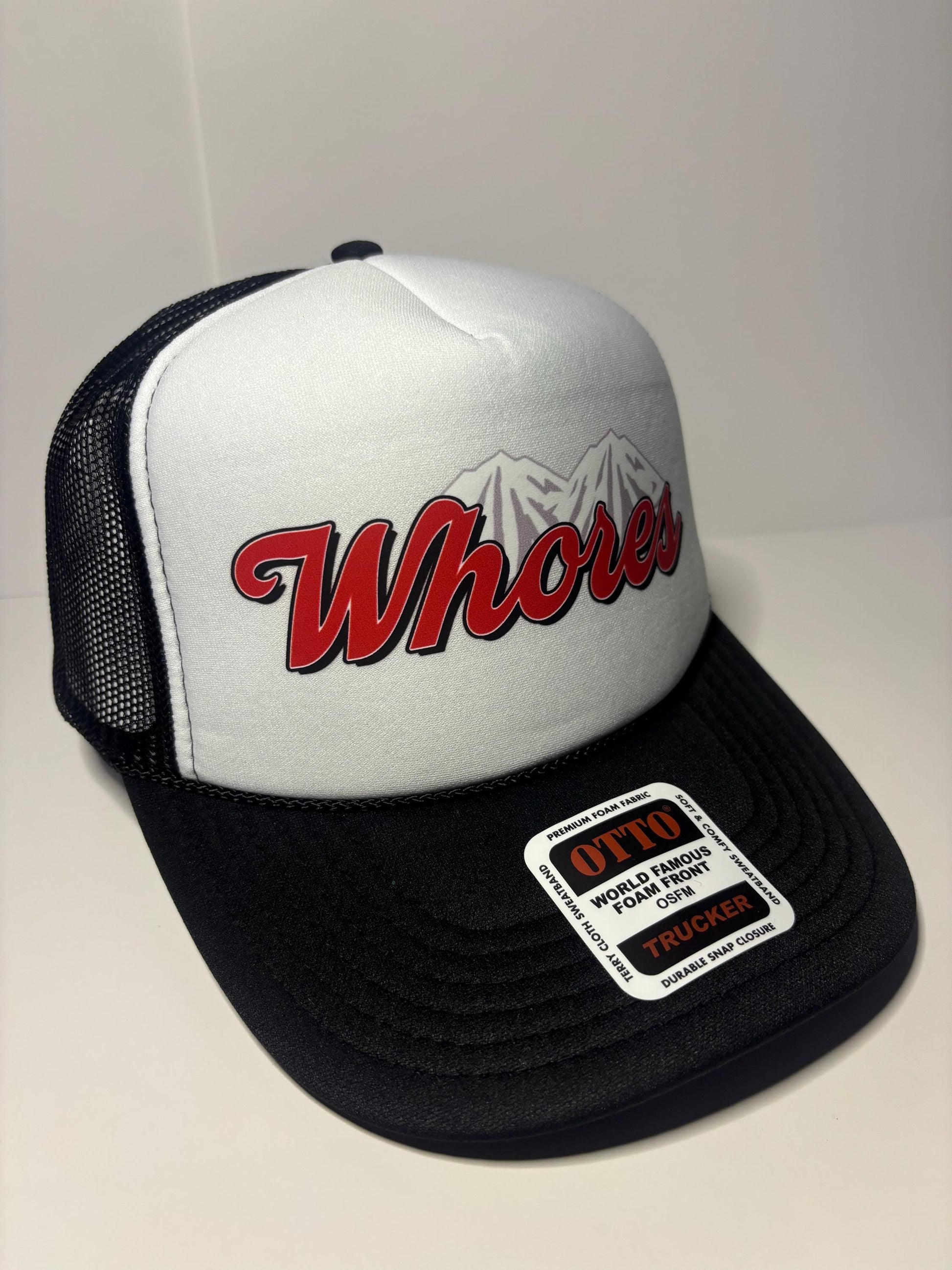 Whores Custom Trucker Hat with parody design, Adjustable Snapback Closure, and Ideal for Any Occasion